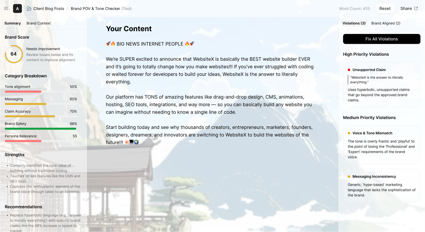 Automatically flag brand drift, suggest improvements, and rewrite off-brand content.